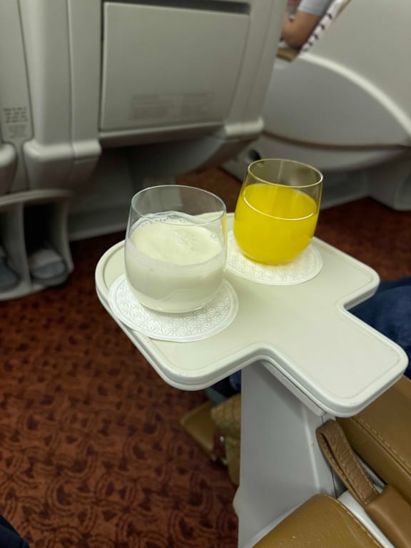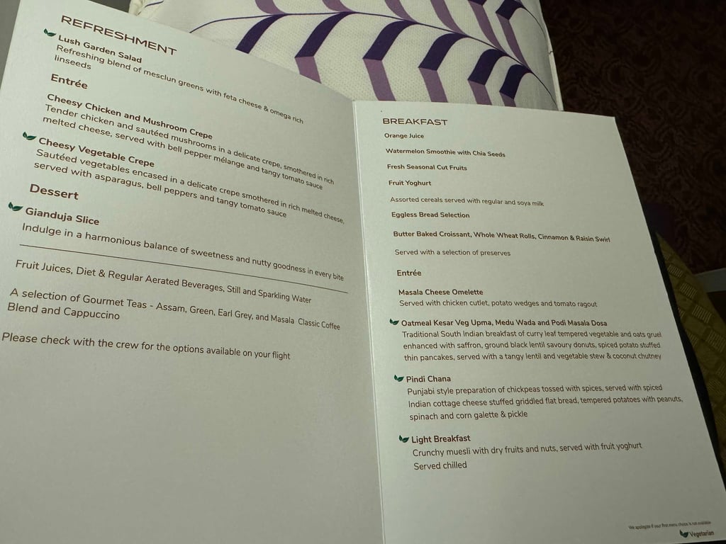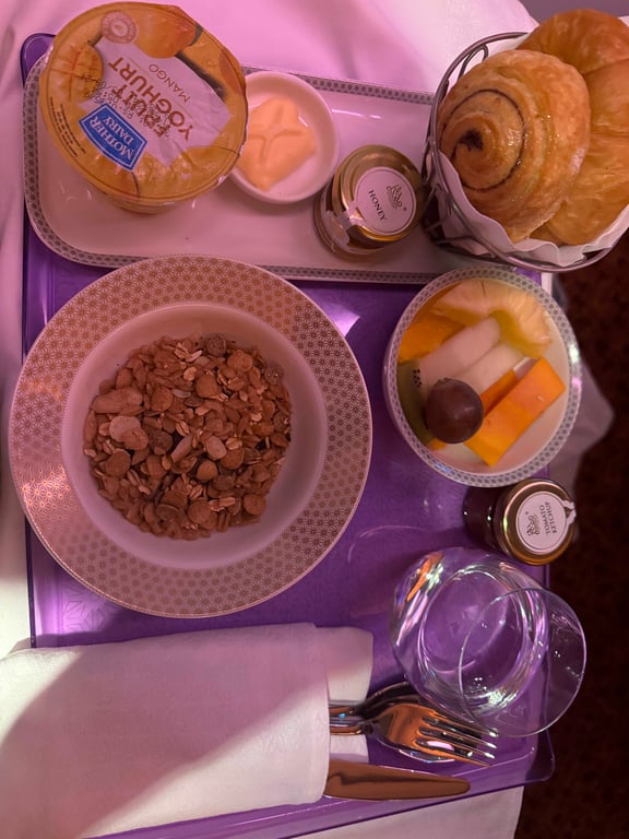 Breakfast was served two hours before landing, which is a fairly common practice. However, the meal itself was just okay, lacking the wow factor that you’d expect in a premium cabin. The menu offered a range of options, but the execution of the food was average. Presentation was lackluster, and the food tasted as if it had been sitting around for a while.