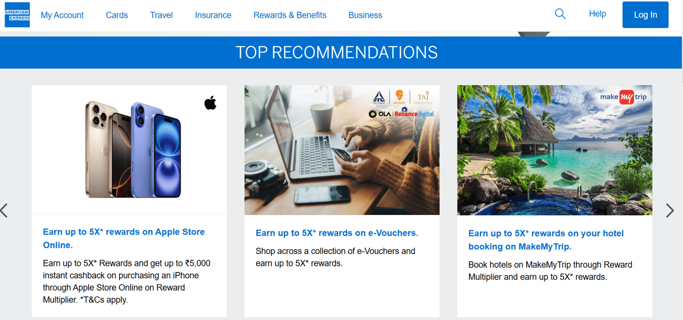 MakeMyTrip – Booking flights or hotels? Use the Amex Reward Multiplier and earn 5X points.