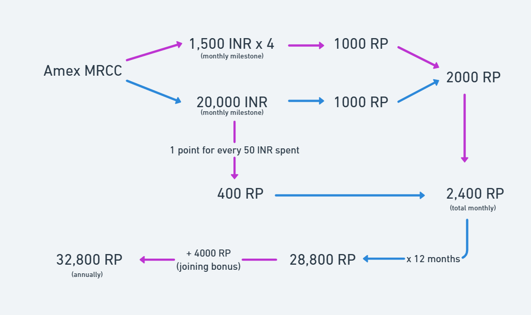 Base Reward: For every 50 INR spent on your MRCC card, you earn 1 point. So, if you spend 20,000 in a month, you’ll get an additional 400 points.