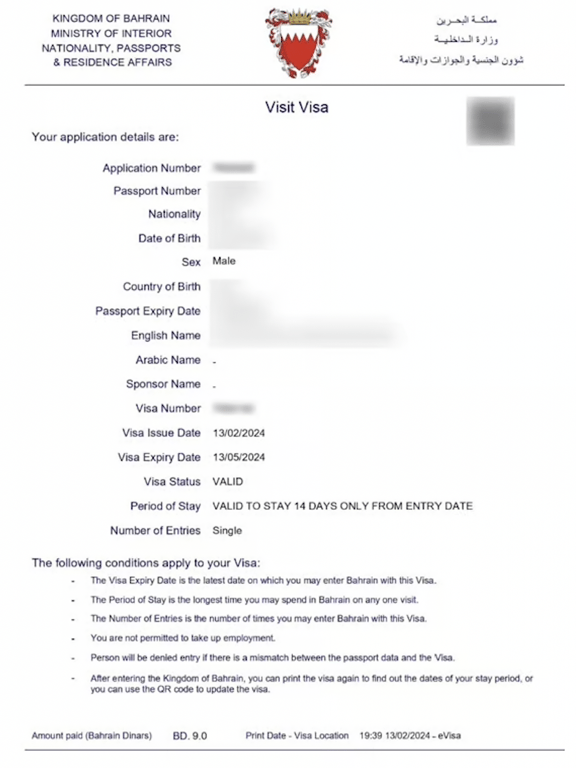 Once your Bahrain visa is approved, you will receive it by email as a PDF document. This is sent to the email address you provided during the application process. Your Bahrain Visa will look like: