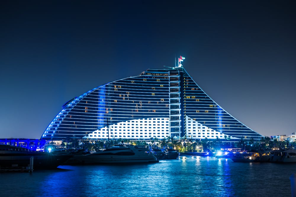 This is a wave-shaped architectural wonder that’s been redefining luxury since 1997. Its design mimics the gentle curve of a breaking wave, perfectly complementing its location right on the beach. Pair that with its shimmering glass façade and prime views of the Burj Al Arab, and you’ve got a hotel that’s just as much about aesthetics as it is about indulgence.