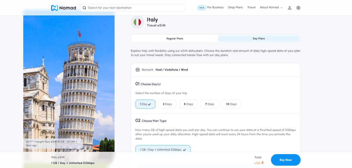 Data plans and validity: For Italy, Nomad eSIM plans start at $4.50 for 1 GB, valid for 7 days and go up to $45 for 50 GB, valid for 30 days. Alternatively, day plans (1GB/day) are available for 1,3,5,7 and 10 days. [Note: Regional plans are available for those visiting Italy and neighbouring countries.]