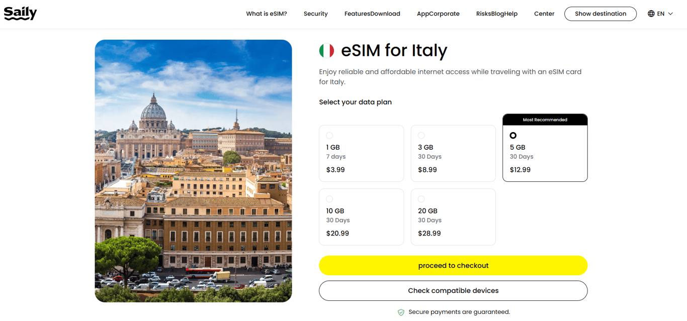 Saily eSIM is also one of the best eSIM(s) for Italy, offering affordable data plans, strong coverage, easy activation and advanced security features.
