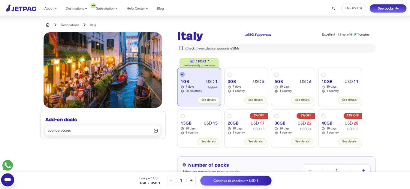 JetPac offers one of the cheapest eSIM plans for Italy.