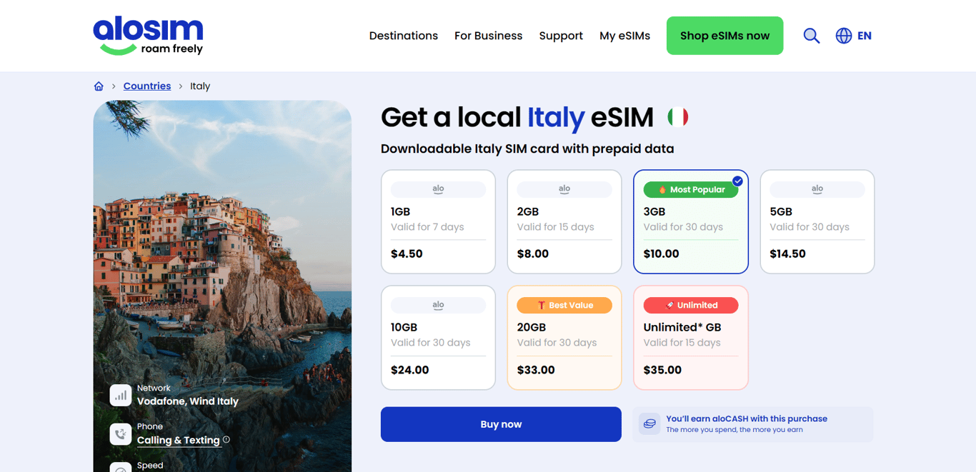 Internet speed: With LTE and 5G speeds, aloSIM ensures the smoothest browsing, video streaming, and navigation in both Italy’s bustling cities and remote regions. Local partnering networks are Vodafone and Wind Italy.