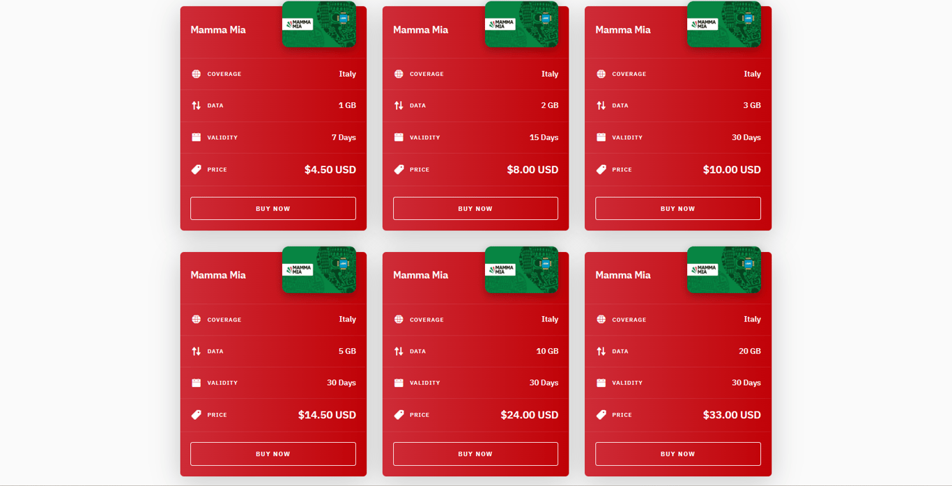 Data plans and validity: JetPac offers a variety of prepaid data plans for Italy. The plans start at $5 for a 3 GB data plan, valid for 7 days and go up to $28 for a 40 GB data plan for 30 days.