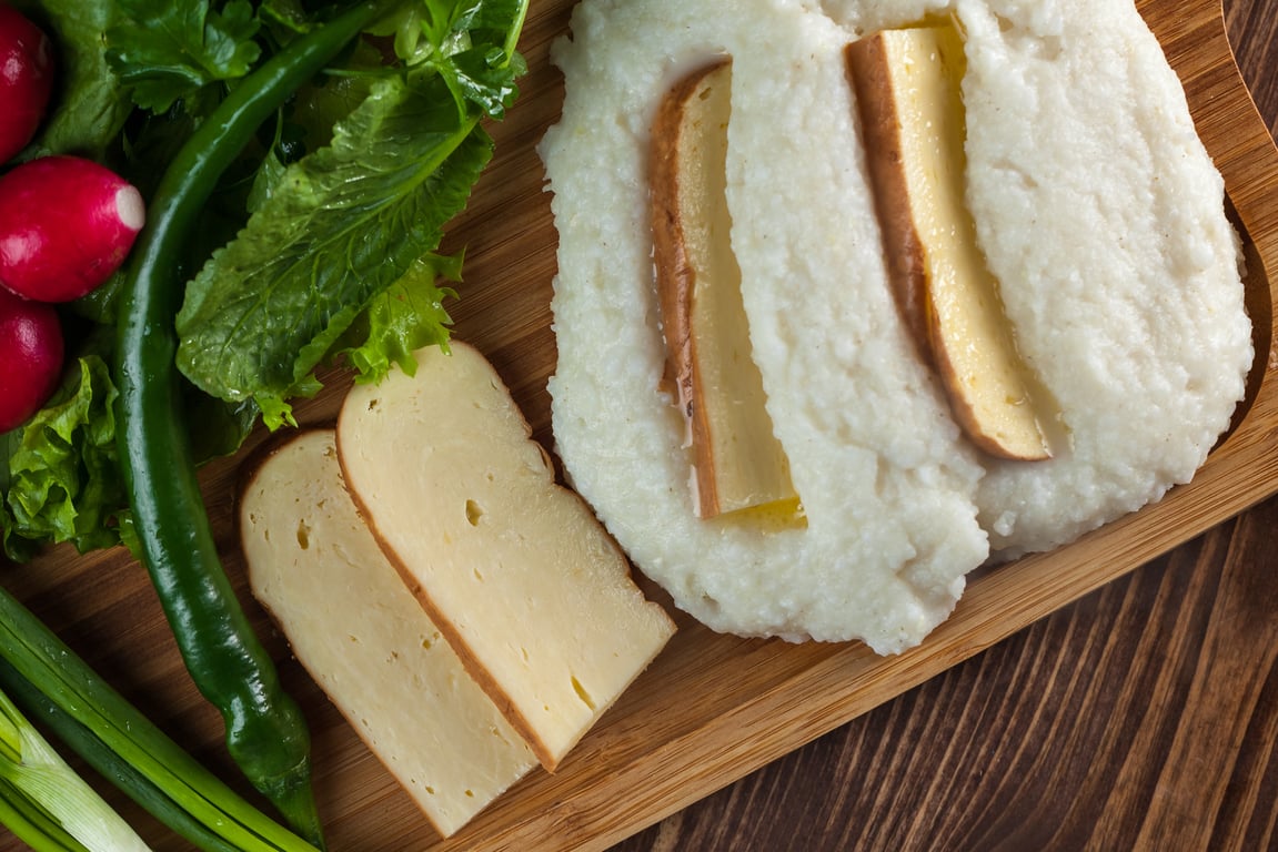 Ghomi is a traditional dish originating in western Georgia, primarily in the regions of Samegrelo and Imereti. The dish reflects Georgia’s focus on simple, fresh ingredients. It is made by cooking coarse cornmeal in water until it thickens into a soft, creamy consistency. Sometimes, sulguni cheese is added to the hot mixture, melting into the Ghomi and creating a stretchy, savoury delight.