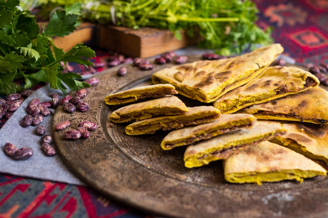 Lobiani is one of Georgia’s most comforting baked goods. Although the dish is especially popular on Barbaroba (St. Barbara’s Day), its rich flavour and satisfying filling make it a year-round favourite. The dough, similar to that of khachapuri, is stuffed with mashed kidney beans flavoured with onions, garlic, and spices such as coriander. The filled dough is baked until golden, creating a crispy exterior and a soft, savoury interior.