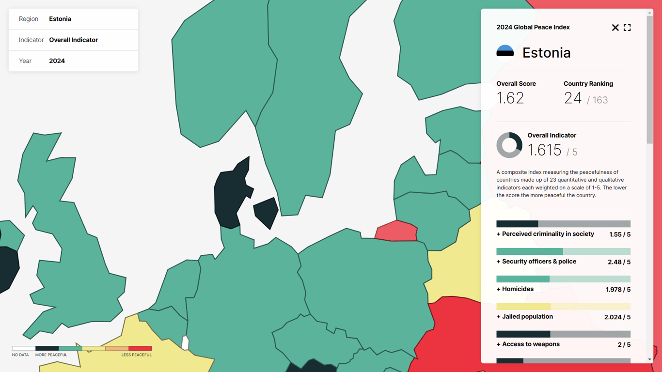 Estonia ranks 24th out of 163 countries on the 2024 Global Peace Index.