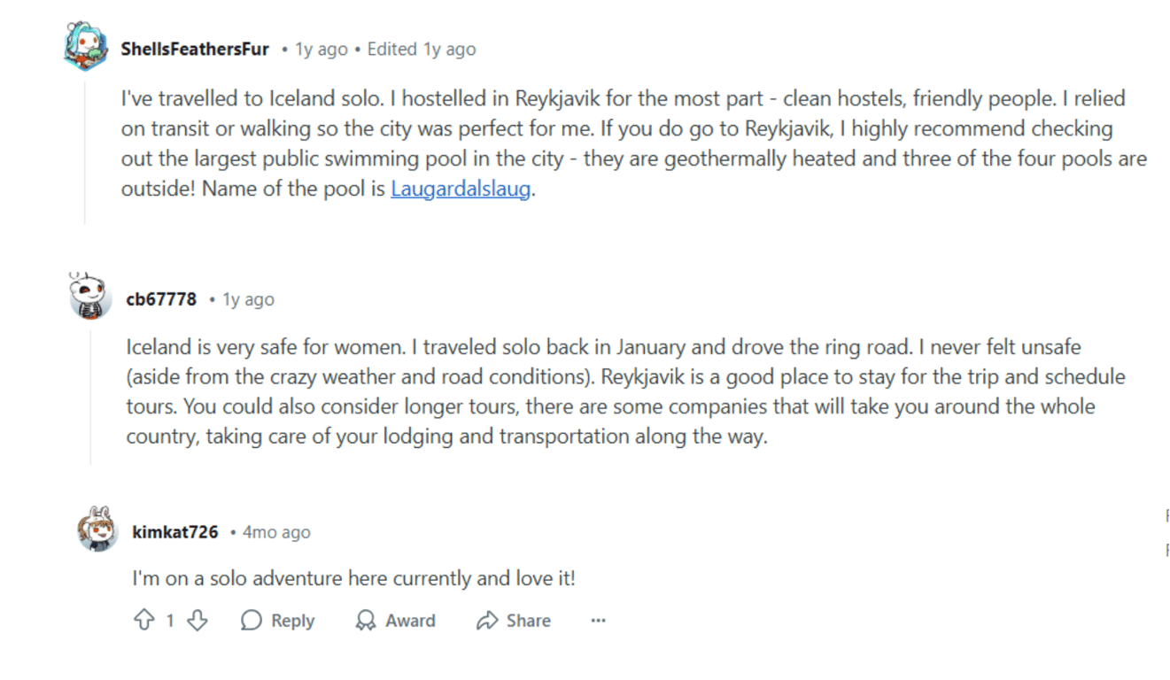 The Blue Lagoon: One of Iceland’s most famous attractions, the Blue Lagoon is a geothermal spa with mineral-rich waters that offer relaxation and skin benefits. Since the Blue Lagoon is a controlled environment, it is completely safe for solo travellers. However, booking in advance is recommended as tickets sell out quickly.