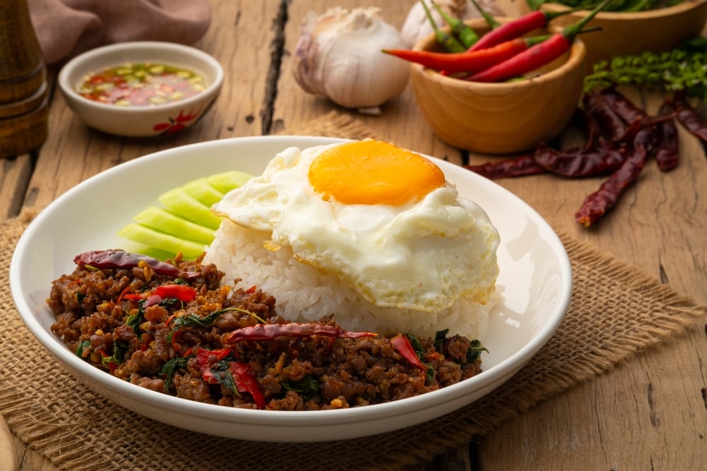 A classic Pad Kra Pao meal: spicy stir-fried pork with holy basil leaves over rice, crowned with a crispy fried egg. When Thai office workers line up at street stalls during lunch, they often order Pad Kra Pao. This simple yet irresistible dish is a stir-fry of meat with holy basil, considered one of Thailand’s quintessential street meals. Typically made with minced pork (“moo”) or chicken (“gai”), it’s quickly wok-fried with plenty of garlic, fresh chillies, and a big handful of fragrant holy basil leaves, along with seasonings like soy sauce, oyster sauce, and fish sauce. Pad Kra Pao is the ultimate comfort food for many Thais- spicy, garlicky, and hearty, with the aromatic peppery kick of basil.