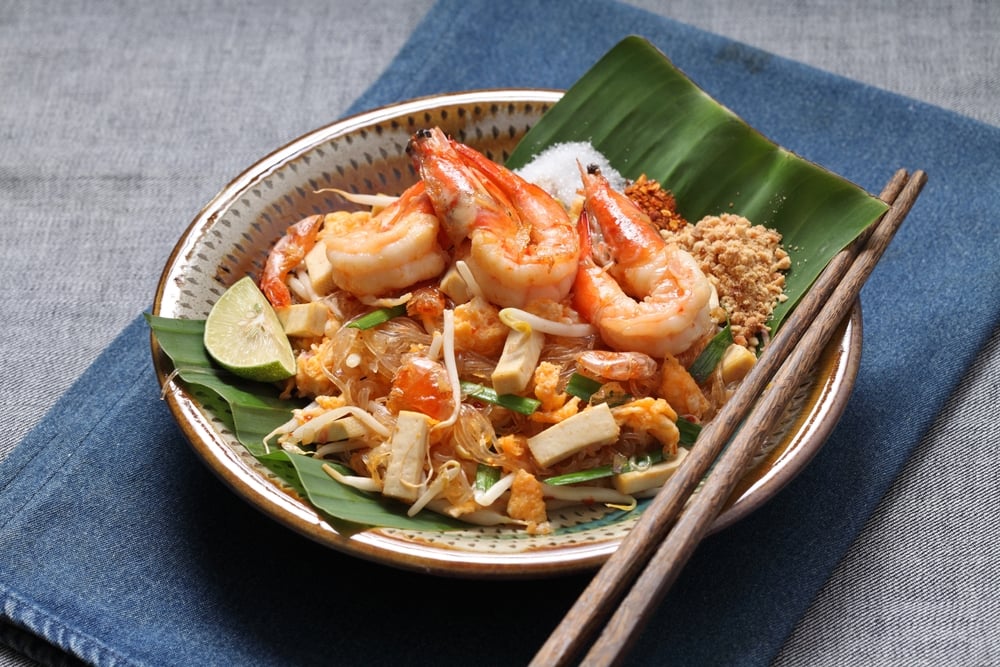 A freshly made Pad Thai plate with prawns, tofu, peanuts, and lime, a colourful classic of Thai street cuisine. Pad Thai is Thailand’s most famous street food export, a flavorful stir-fried noodle dish that is practically a national dish. It features thin rice noodles tossed in a hot wok with egg, tofu, bean sprouts, and shrimp, all coated in a balanced sweet-and-tangy tamarind and fish sauce sauce. Crushed peanuts, dried shrimp, garlic, chilli flakes, and a squeeze of lime are added as garnishes, giving Pad Thai its signature mix of sweet, sour, salty, and spicy notes in every bite.