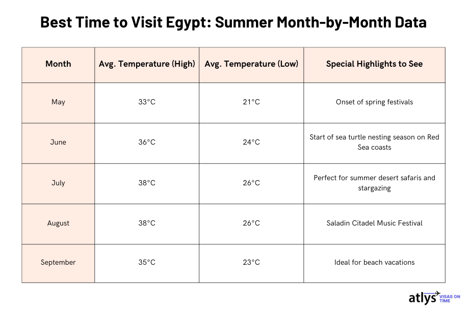 Tip: If you are planning a summer getaway to Egypt, here are a few tips: Schedule outdoor activities early in the morning or after sunset to avoid the peak heat; stay hydrated; wear lightweight clothing and use sun protection to combat the intense sun; and book accommodations in advance for coastal areas to secure the best rates and locations.