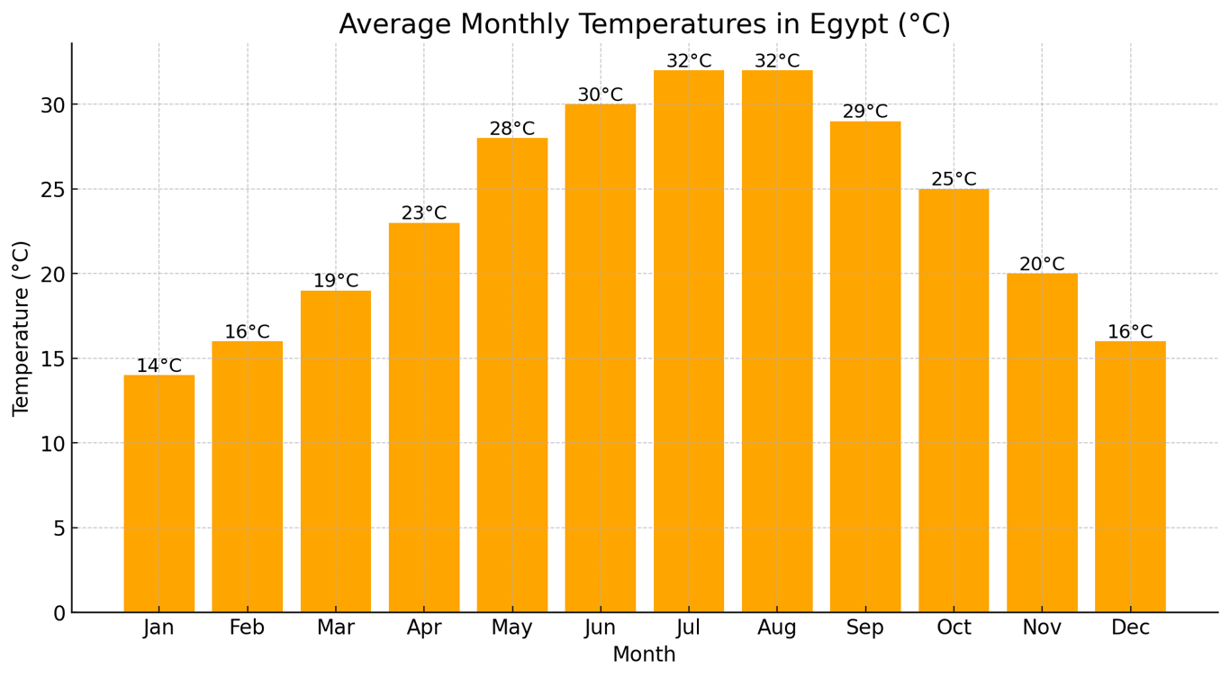 To provide a visual overview, here is a bar graph representing Egypt’s month-by-month average temperatures (°C):