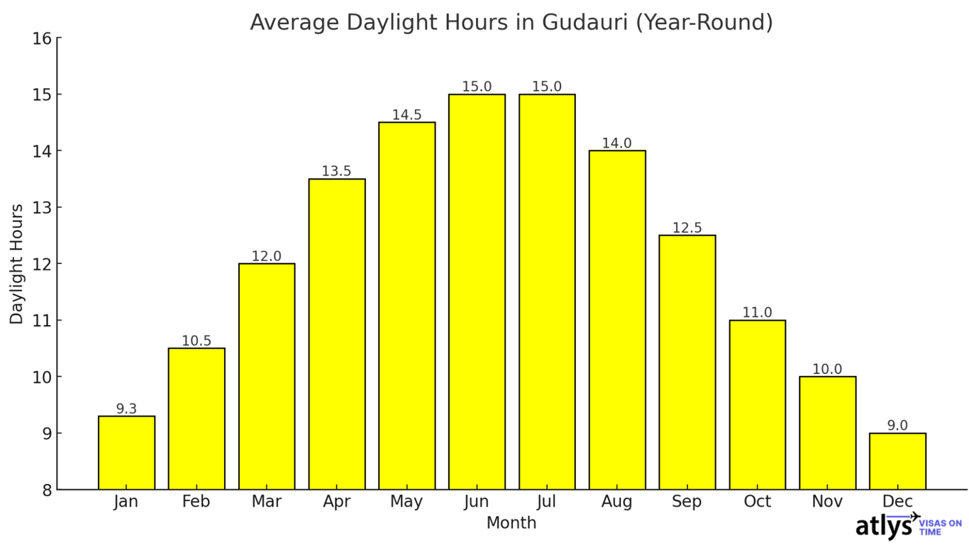 A quick visual snapshot of the average yearly daylight hours in Gadauri, the most visited ski resort in Georgia.
