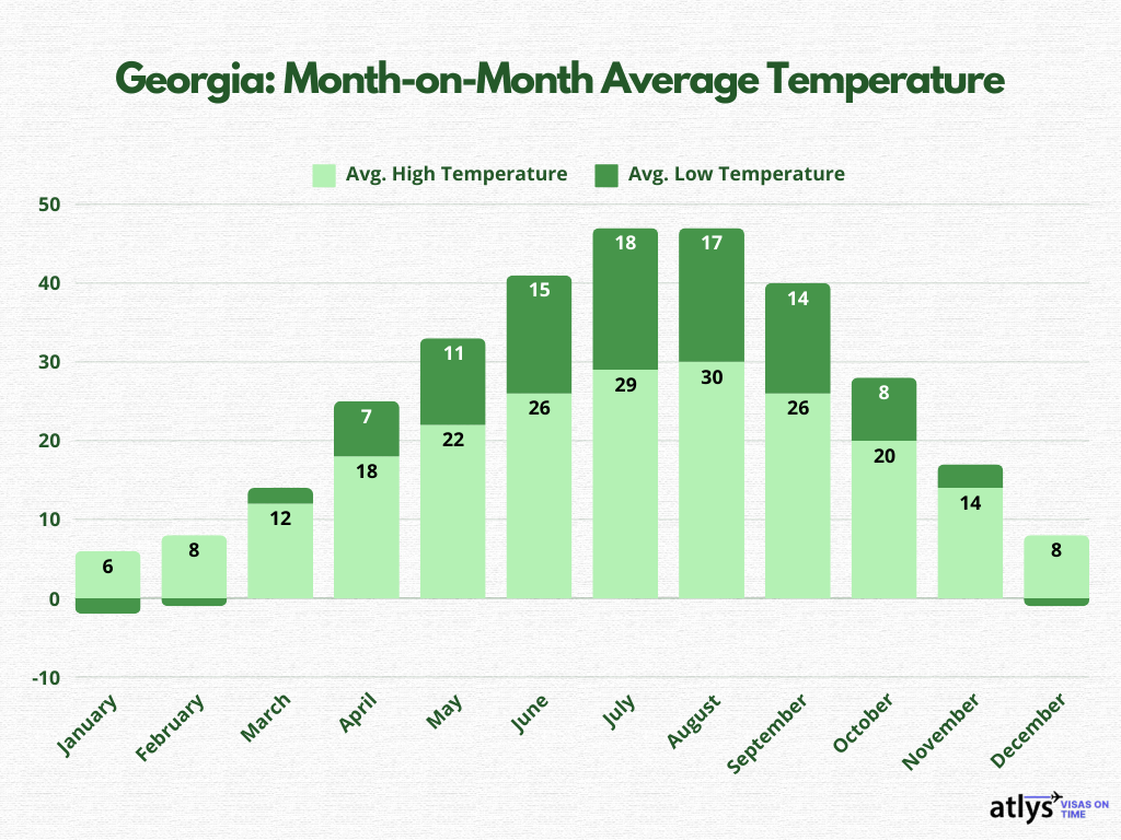 Before we delve deeper into each season, let us know Georgia’s weather at a glance.