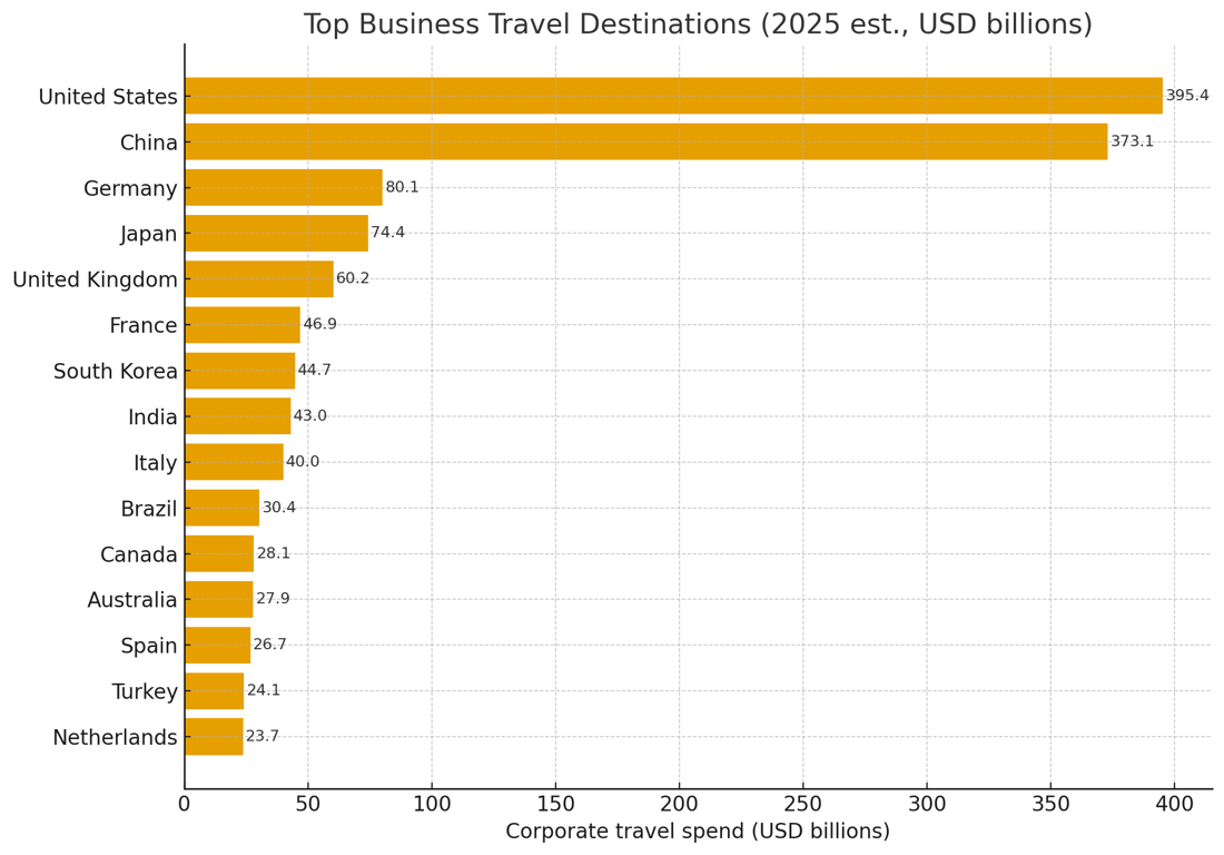 The U.S. and China together make up well over half of the spending among the top-15 markets, with Europe’s big five (Germany, U.K., France, Italy, Spain) forming the next tier. Independent outlooks also flag record-level global spend in 2024–2025 (around $1.48–$1.57T), so these top markets are operating at or above pre-pandemic nominal peaks. Here are the major business-travel markets (by total corporate travel spend) and the top countries with 2025 estimates: