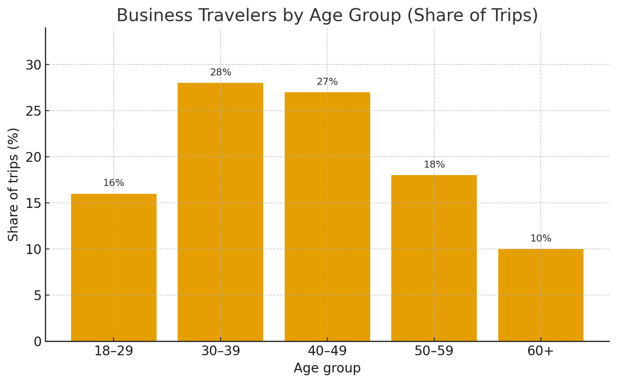This age split is based on a U.S. business travel analysis. It shows that mid-career professionals dominate corporate travel, with those aged 30–39 (28%) and 40–49 (27%) together accounting for 55% of trips, reflecting the client-facing, management, and project roles that are most likely to require travel. Early-career travellers, aged 18–29 (16%), form a meaningful but smaller share often in sales development, field operations, or training, while older cohorts, aged 50–59 (18%) and 60+ (10%), still contribute substantially, consistent with executive, specialist, and governance travel. In short, the survey indicates that business travel is skewed toward mid-career workers, with notable participation from both younger pipeline talent and senior decision-makers.