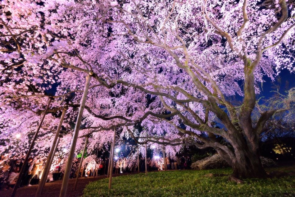 Stay until sunset to watch the trees light up for the nighttime hanami.