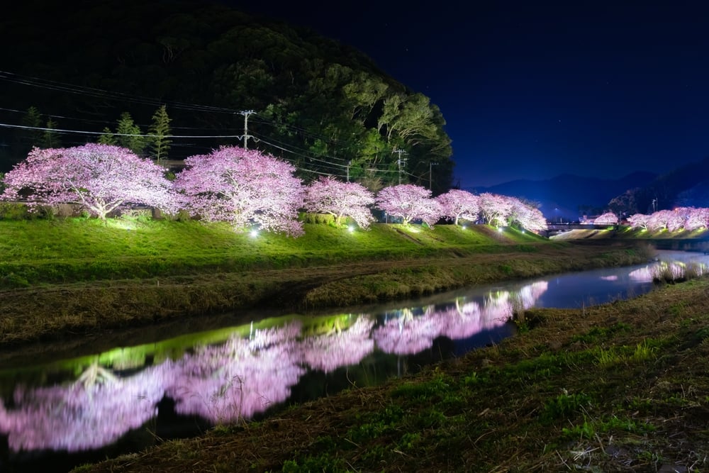 Kawazu (Izu Peninsula, Shizuoka): Famous for Kawazu-sakura, an early-blooming cherry blossom variety that flowers in February. These trees have deep pink petals and draw visitors looking for an off-season hanami experience.