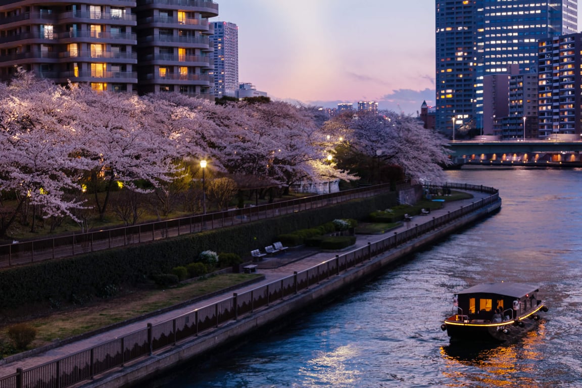Cruise along the Imperial Palace moat or the Sumida River at sunset, passing beneath pink canopies with the city skyline in the background.