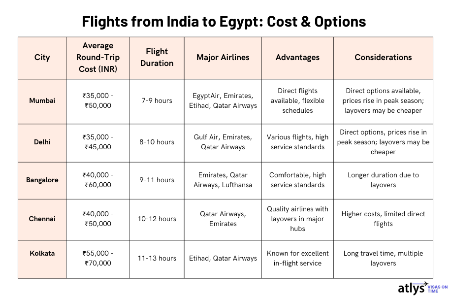 Flying is the most convenient way to reach Egypt from India, thanks to Egypt's strong connectivity with major Indian cities.