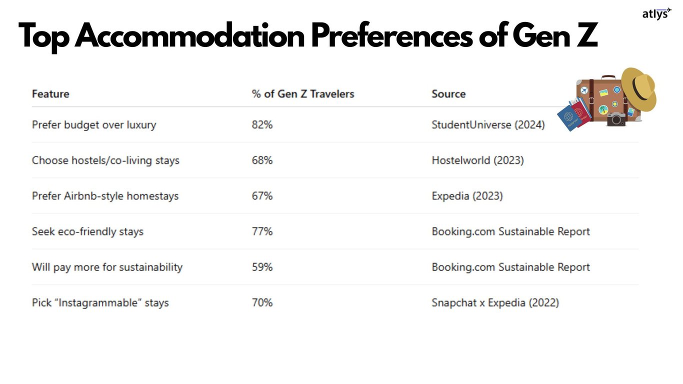 Gen Z is the most digitally fluent travel segment. Their accommodation choices are influenced by: