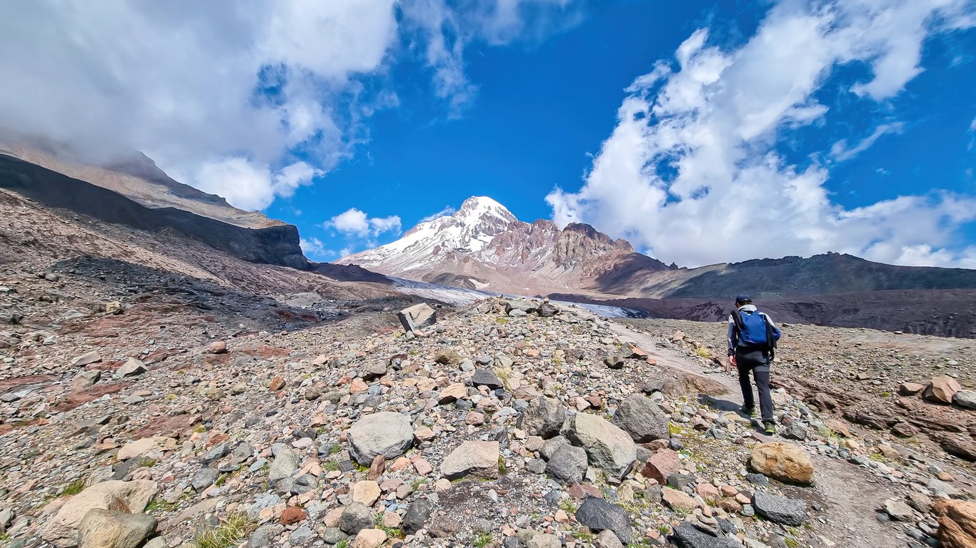 Option 1: If you are an experienced hiker, continue the trek beyond Gergeti Trinity Church toward the Gergeti Glacier (6–7 hours total). The path takes you through alpine meadows, rugged mountain terrain, and closer to the towering slopes of Mount Kazbek.