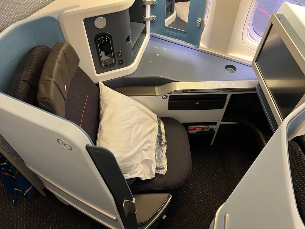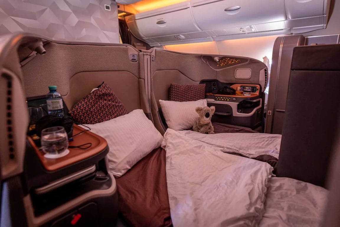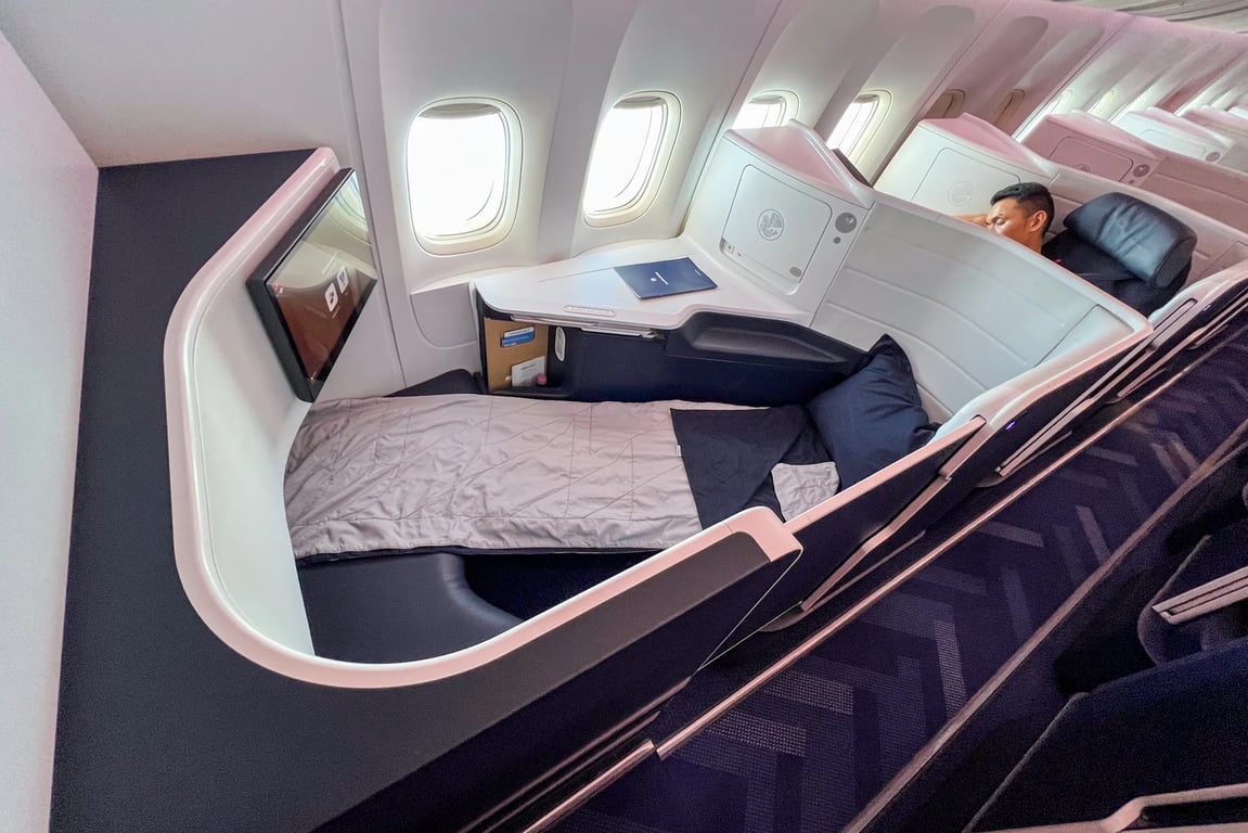 The moment you step into the cabin, you're welcomed with a glass of champagne, setting the tone for what’s ahead. The seats transform into a fully flat bed with ample space, perfect for stretching out on this nearly 10-hour flight.
