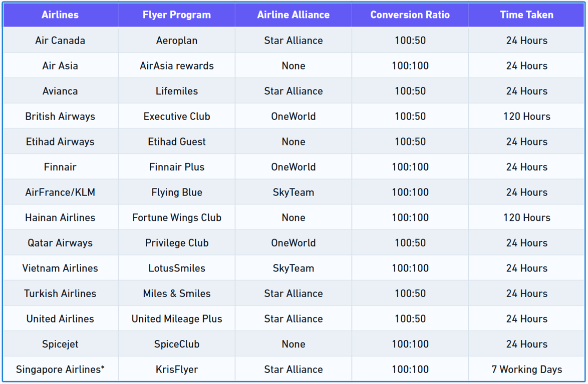 Here's a quick summary of the partner airlines, their alliances, the conversion ratio, and time taken for each transfer: