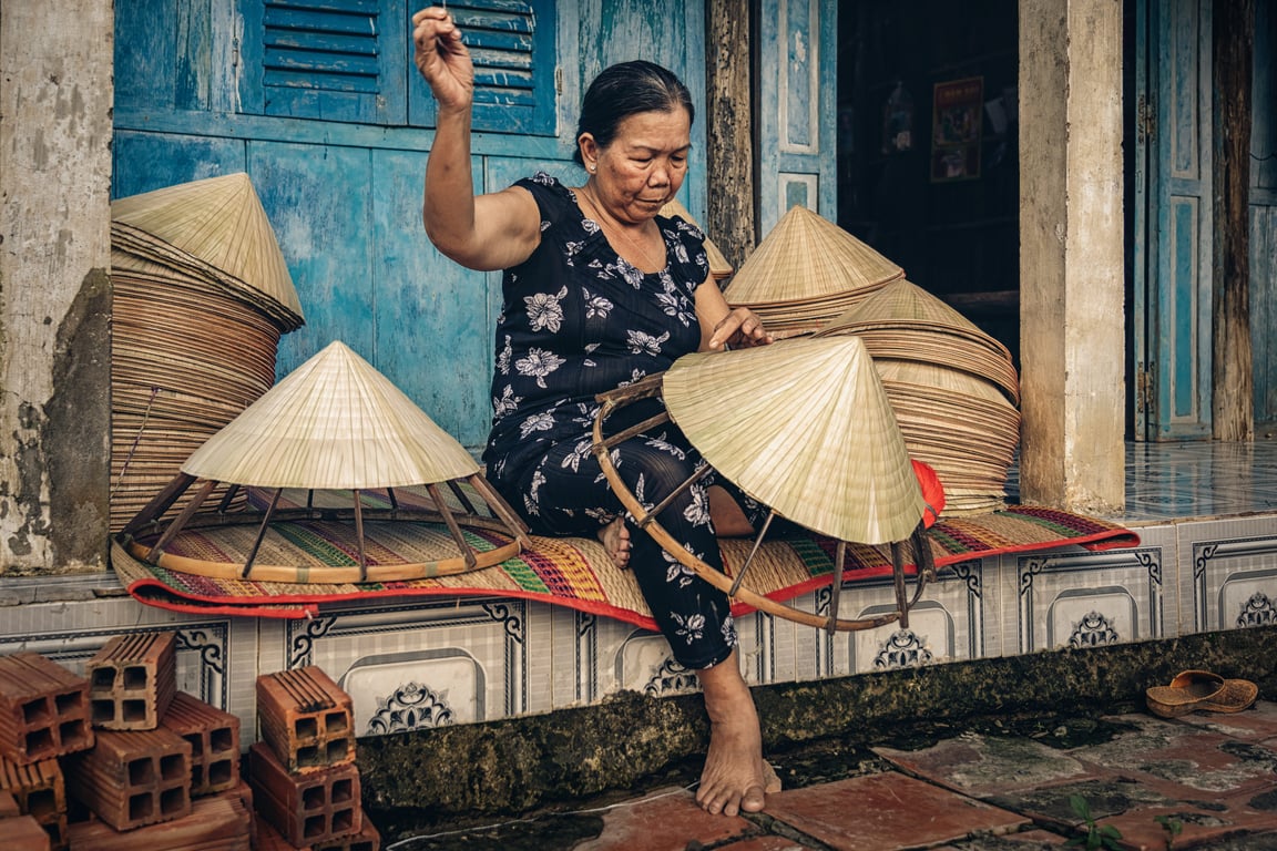 Nón lá, or the Vietnamese conical hat, is a traditional headpiece made from bamboo and palm leaves, known for its distinctive shape and lightweight design. It serves as practical sun and rain protection for farmers and laborers while symbolizing Vietnamese culture and heritage. It's a beloved cultural icon and a popular souvenir.