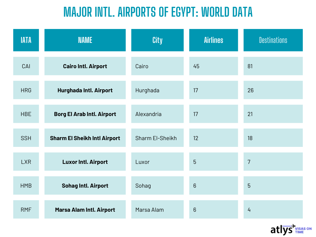 Major Airlines: EgyptAir, Emirates, Etihad, and Qatar Airways.