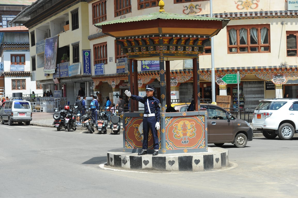 Traffic signals: There are no traffic lights in Bhutan. Traffic cops on podiums regulate traffic in towns like Thimphu.