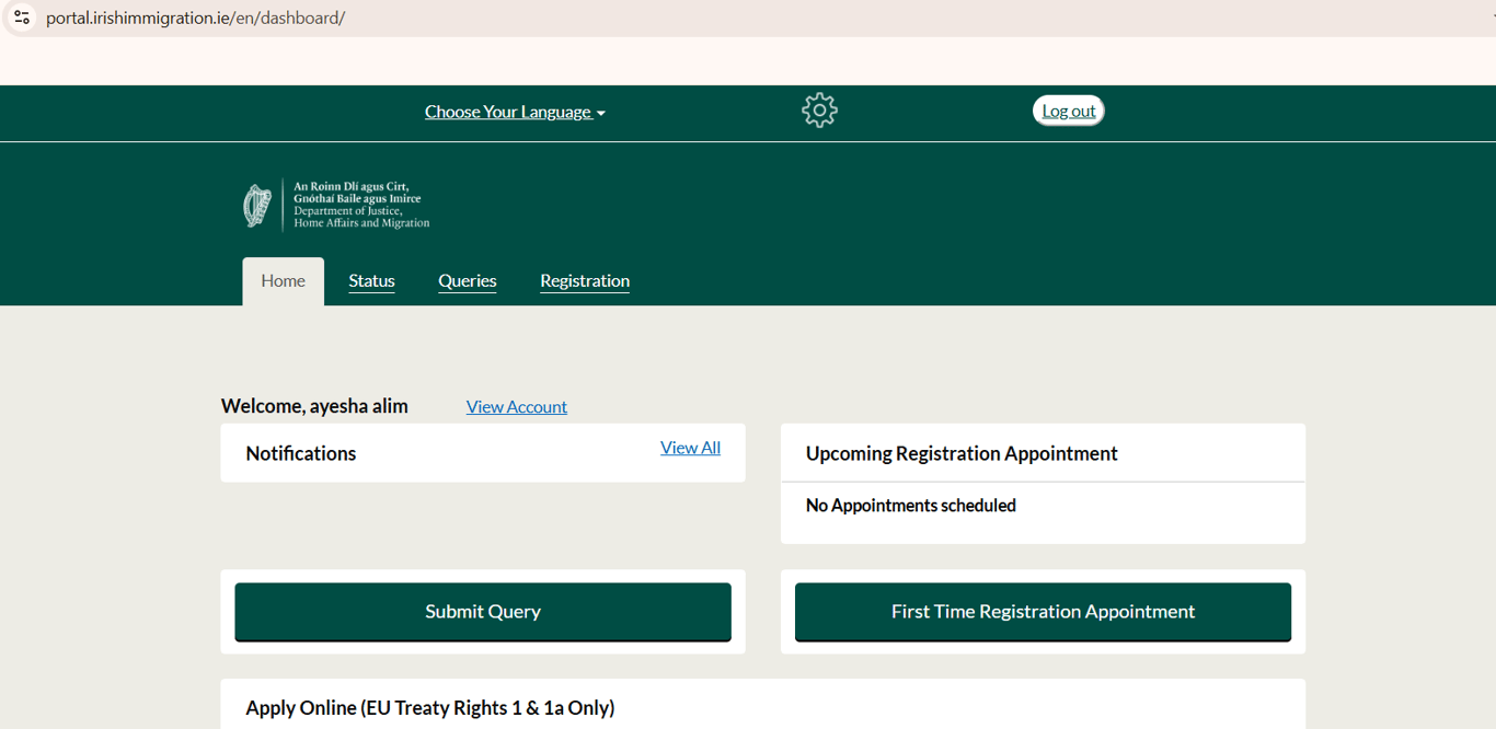 Log in or register yourself by entering your details on the Customer Service Portal on the official Irish Immigration Service Delivery Portal.