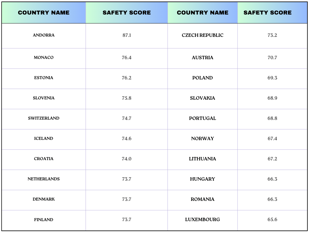 50% of European countries have a safety score above 60/100, proving the continent’s general safety.