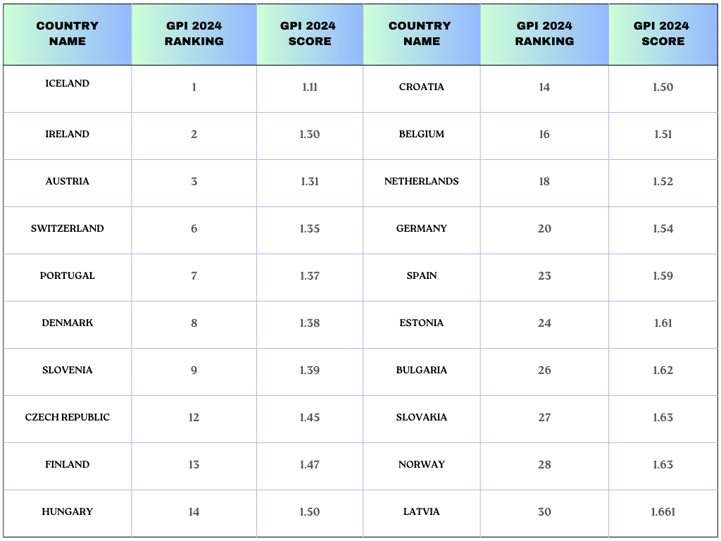 Europe is politically stable, with 20 countries ranking in the top 30 of the Global Peace Index 2024.