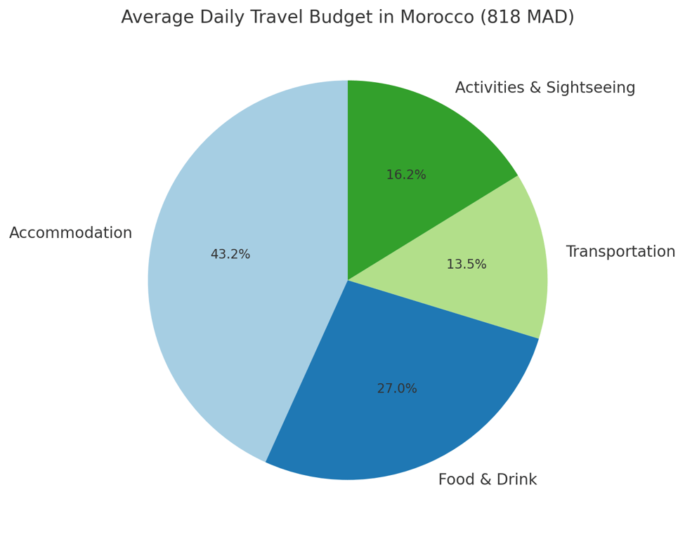 So, what does an average day in Morocco cost? For a mid-range traveller seeking comfort, you’re considering spending roughly 800-1,000 MAD daily on essentials (accommodation, meals, local transport, and activities). Actual costs vary by city and season, but travel data shows that average mid-range travellers spend about MAD 818 daily. A one-week trip might total around MAD 5,700-7,000 for one person (excluding international flights). Here’s a quick breakdown of where that daily budget might go: