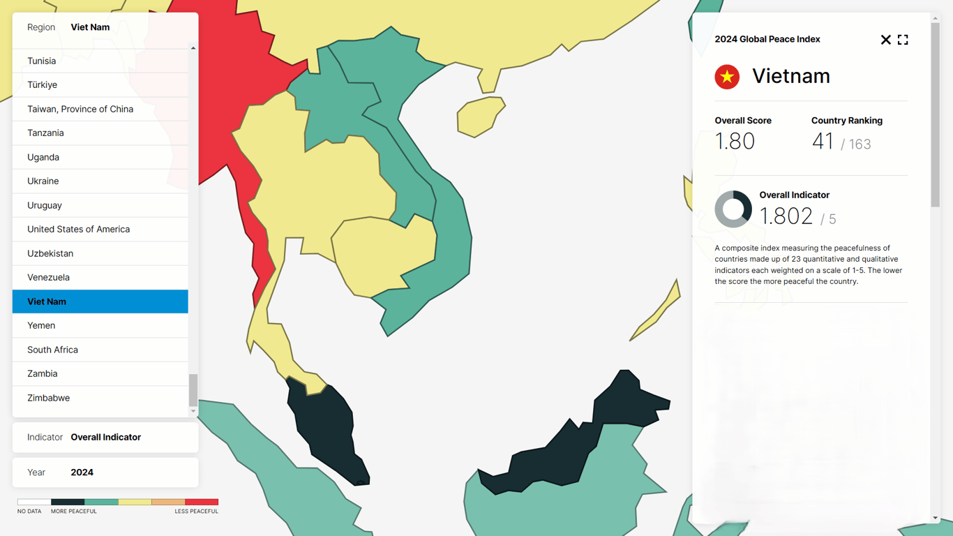 Having experienced no major external or internal conflicts since 1975, Vietnam ranks 41st (among 163 countries) in the 2024 Global Peace Index (GPI).