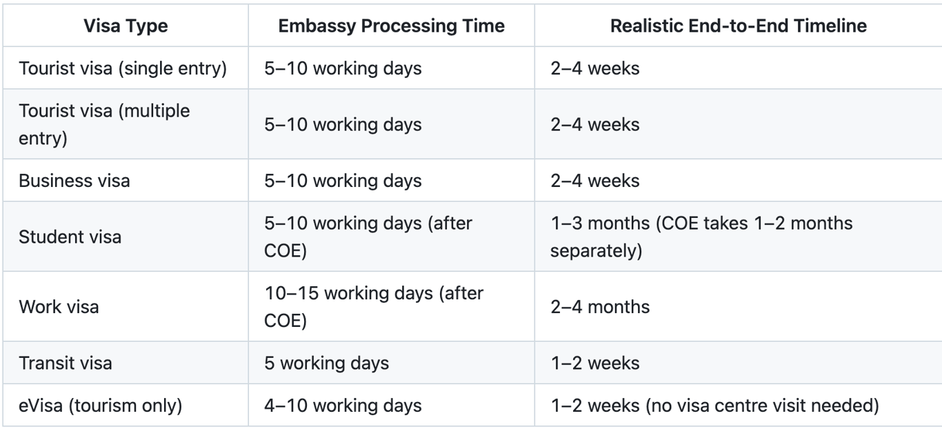 Important: Embassy processing time only starts after your complete application is received — not from the date you book your appointment or submit at the visa application centre. If documents are incomplete or the embassy requests additional papers, the clock resets.