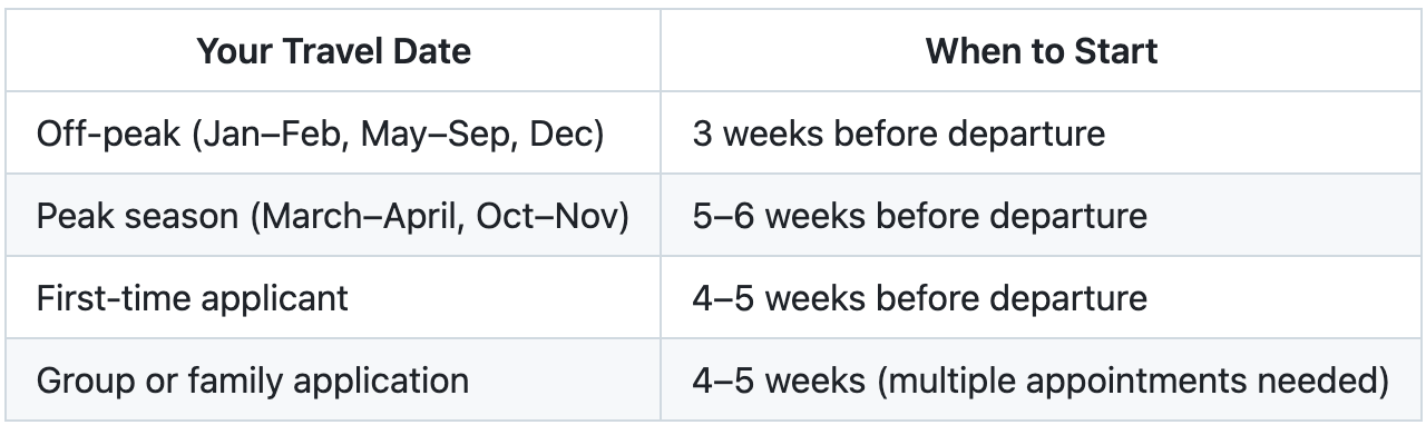 Apply at least 3 weeks before departure during off-peak months and 5–6 weeks before departure during cherry blossom season (March–April) or autumn foliage season (October–November). First-time applicants should allow at least 4 weeks.