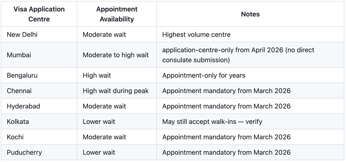 Embassy processing time is the same regardless of which visa application centre you use. However, appointment availability varies — major cities like Delhi, Mumbai, and Bengaluru tend to have longer waits for slots, especially during peak season.