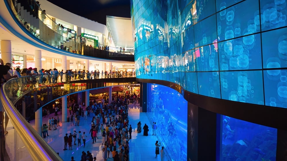Entry is free, but attractions like the aquarium and ice rink cost AED 65–300 ($18–82 USD).