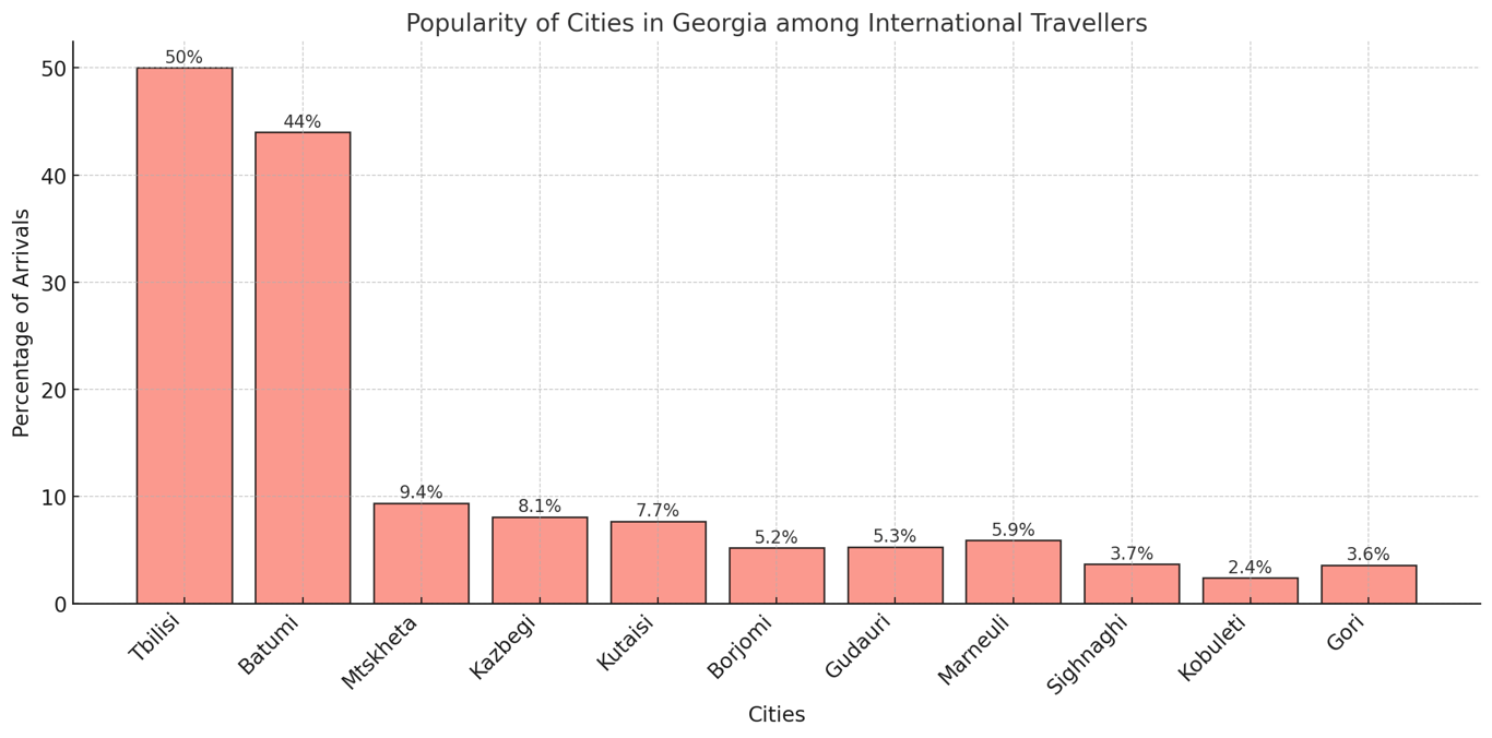 According to recent tourism statistics released by the Georgian National Tourism Administration for 2023, 6,171,540 international trips were made to Georgia. Of these, 50% were to the capital city, Tbilisi, followed by 44% to Batumi. Other destinations saw fewer visitors, with Mtskheta being the most popular among them at 9.4%. Other well-known destinations included Kazbegi, which accounted for 8.1% of international trips, and Kutaisi, attracting 7.7%. Regarding domestic tourism, about 23% of trips were made to Tbilisi, with Kutaisi being the next most popular destination at 9.4%.
