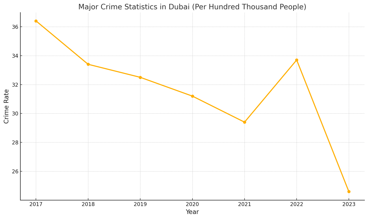 According to the Government of Dubai statistics, The graph shows a declining trend in major crime rates in Dubai from 2017 to 2023, dropping from 36.4 to 24.6 per hundred thousand people. Despite a minor increase in 2022 to 33.7, the rate fell sharply in 2023 to its lowest level in the series. Overall, it highlights consistent improvements in public safety over the years with minor fluctuations.