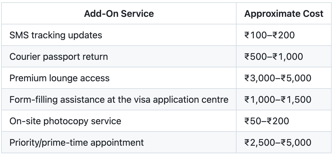 At a traditional centre, you pay separately for: base service charge + SMS tracking + courier passport return + form-filling help + photos + photocopies + premium lounge (if you don't want to wait 3 hours) + priority appointment (if slots are scarce). A typical applicant who wants courier return, tracking, and a reasonable experience spends ₹4,000–₹6,000 on top of the embassy fee — before counting the work day lost to the in-person visit.