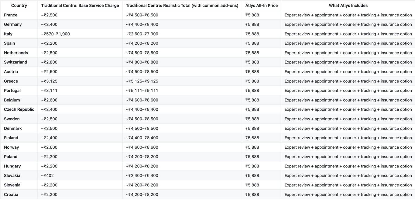 Traditional centre add-on estimates based on Atlys internal fee tracking data across 20+ Schengen consulates in India, updated April 2026. Actual charges vary by city and centre.