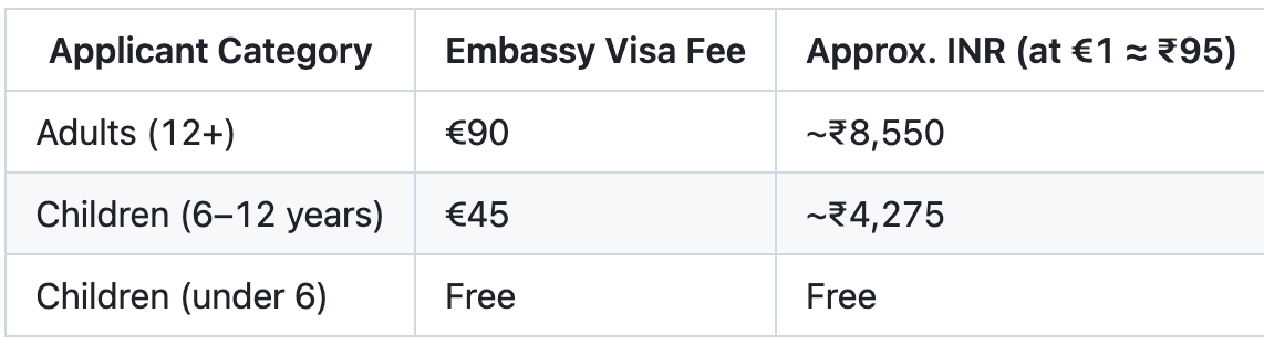 Yes. The embassy visa fee is €90 for adults and €45 for children (6–12) across all 29 Schengen countries. What varies is the visa application centre service charge, which ranges from approximately ₹400 (Slovakia) to ₹3,125 (Greece) depending on the country.