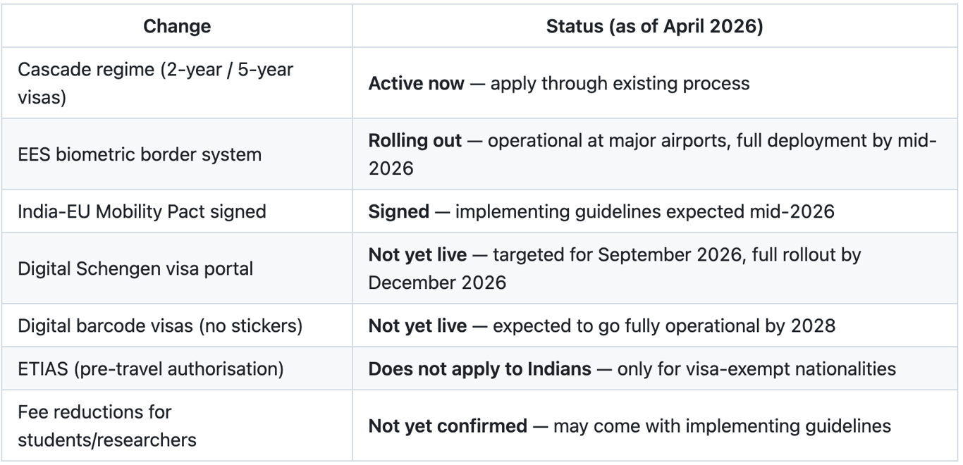 The major changes are: the India-EU Mobility Pact (signed January 2026, awaiting implementation), the Entry/Exit System rolling out across Schengen borders, the transition to digital barcode-based visas (expected 2026–2028), the active cascade regime offering 2-year and 5-year visas for eligible Indians, and stricter holistic risk assessment at consulates.