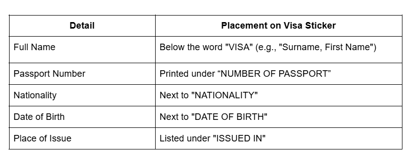 Your details are printed in multiple places on the visa sticker. Here's where you can find them: