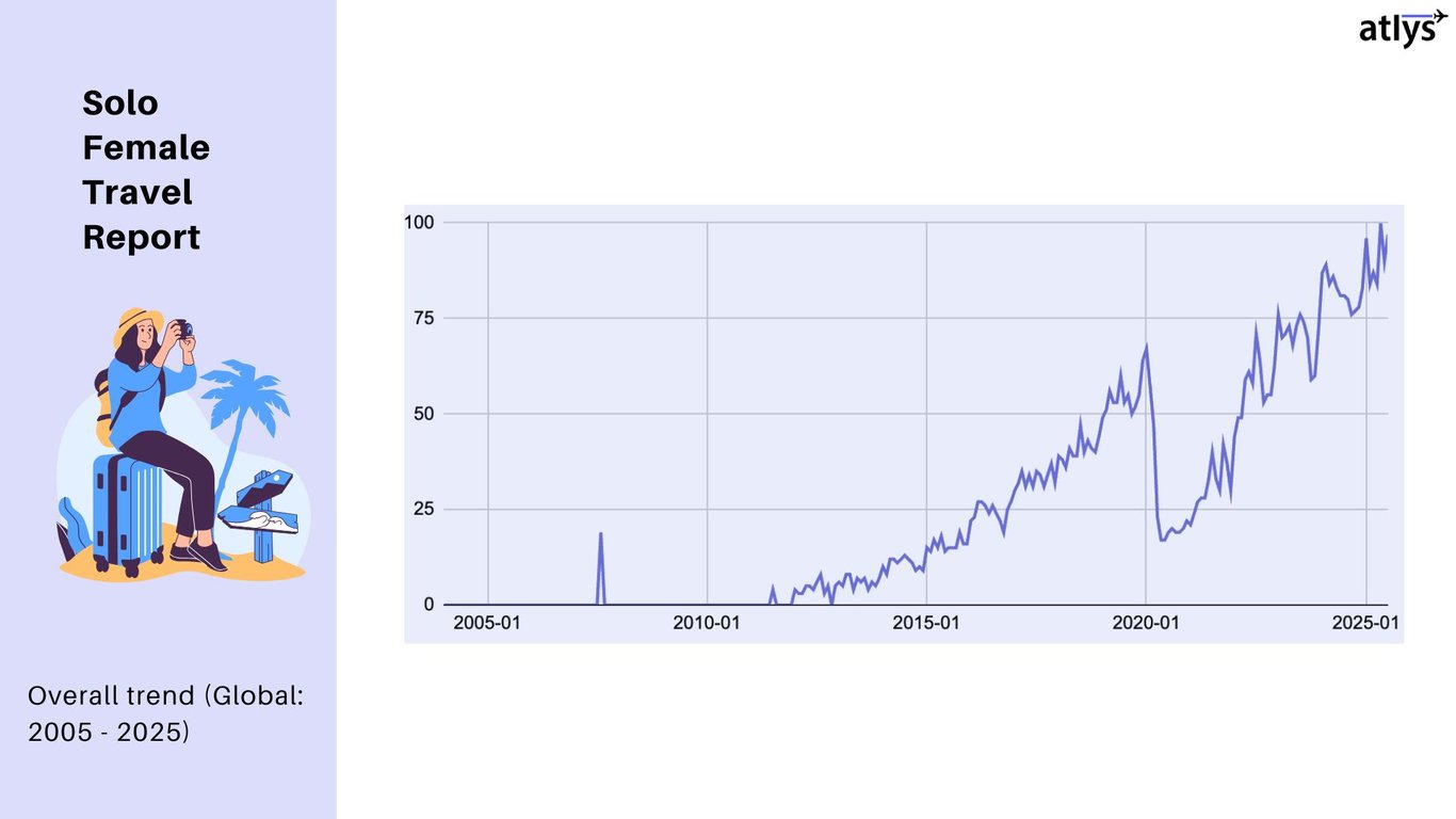 Searches for “solo female travel” tripled in early 2024, surpassing even pre-pandemic search volumes from January 2020.